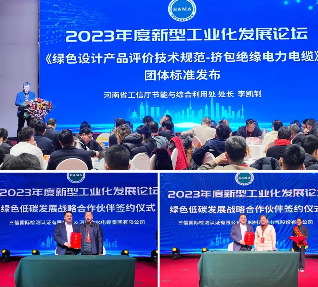 大会成果颇丰,三信国际检测认证有限公司与河南金水电缆集团有限公司、郑州万特电气有限公司现场签订战略合作协议,在推进生态优先绿色低碳发展方面进一步加强合作。李凯钊处长发布了团体标准《绿色设计产品评价技术规范——挤包绝缘电力电缆》,对推动河南省电力行业高质量发展和产业转型升级具有重要意义。