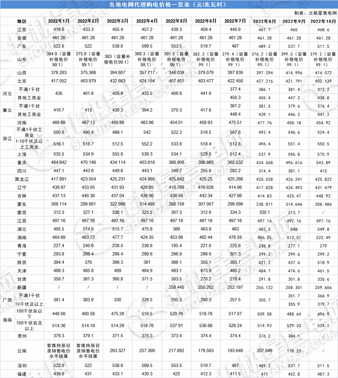 近日,全国各地2022年10月电网企业代理购电价格陆续公布。北极星售电网汇总了2022年1-10月各地电网企业代理购电价格,如下图所示: