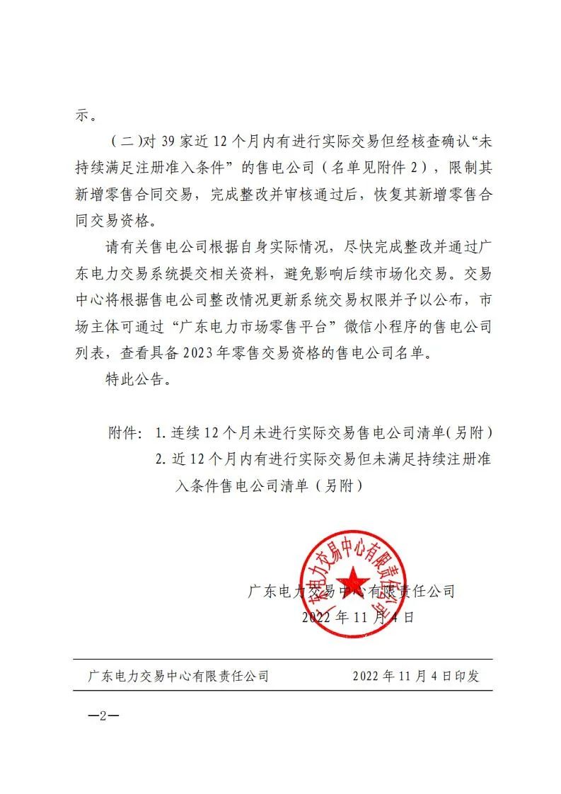 日前广东电力交易中心发布关于广东电力市场2022年售电公司持续满足注册准入条件专项核查处理情况的公告,公告显示,对50家连续12个月未进行实际交易的售电公司暂停交易资格,对39家近12个月内有进行实际交易但经核查确认“未持续满足注册准入条件”的售电公司,限制新增零售合同交易,完成整改并审核通过后,恢复新增零售合同交易资格。