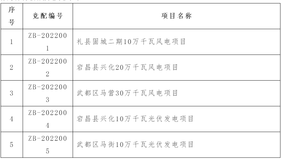 12月16日,甘肃省陇南市发改委发布陇南市“十四五”第二批风光发电项目竞争性配置公告。本次竞争性配置的并网规模为80万千瓦,包含3个风电项目(合计60万千瓦)、2个光伏发电项目(合计20万千瓦)同时竞配,各标段项目竞配信息见下表: