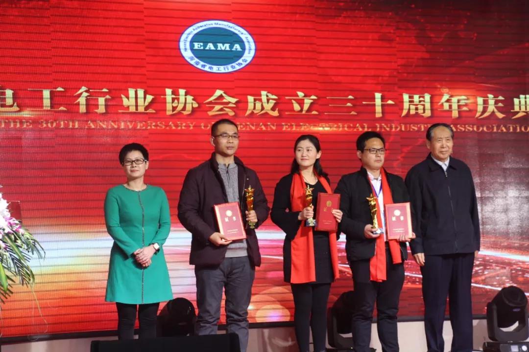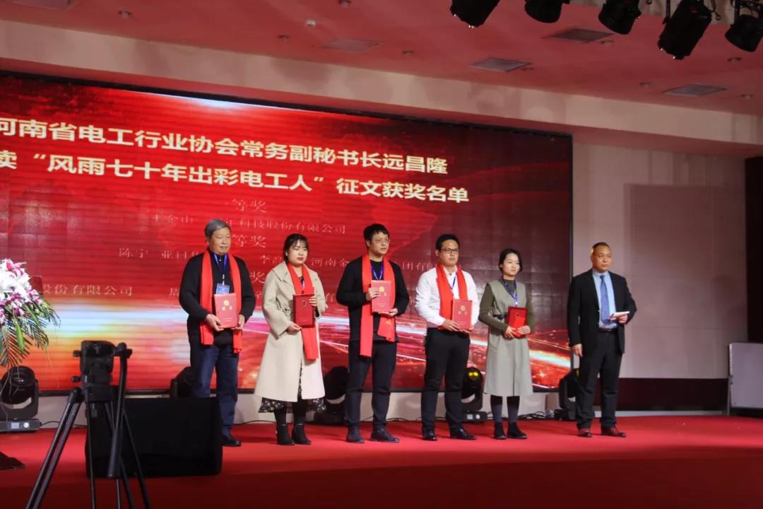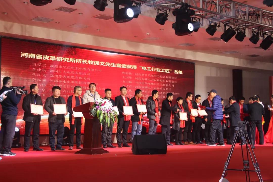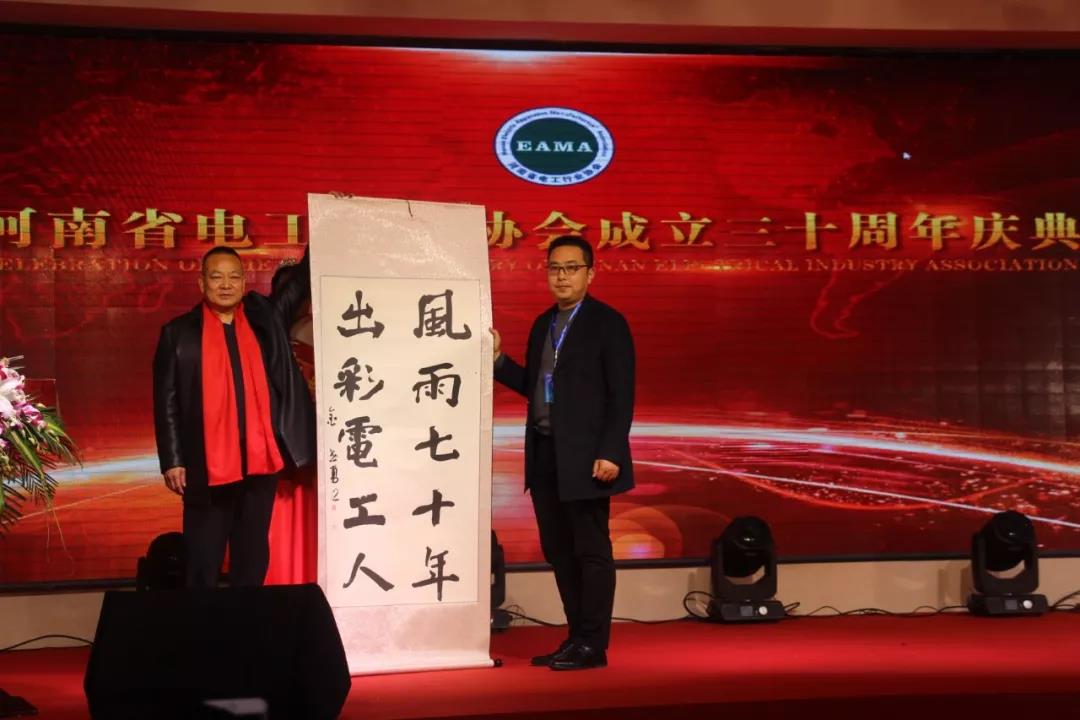 “风雨七十年、出彩电工人”,本次年会对河南电工杯征文的优秀文章给予了表彰和奖励,对2019年度行业创新项目、电工行业工匠、电工行业诚信口碑单位、质量领跑者诚信单位、电工行业诚信领军人物和诚信功勋人物等进行了授牌和表彰。会议现场,纪年科技监事会主席王金山先生为协会三十周岁生日赠送“风雨七十年 出彩电工人”书法一幅,并发表感言,祝贺伟德国际1946官方网站成立三十周年庆典暨电工工业互联网高峰论坛胜利召开;亚日集团、豫东商会也分别向协会赠送了书法和绘画作品。