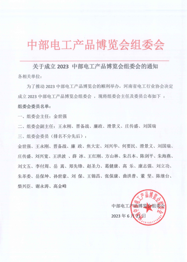 为了推动 2023 中部电工产品博览会的顺利举办,伟德国际1946官方网站决定成立 2023 中部电工产品博览会组委会 ,现将组委会主任及委员公布如下:组委会委员名单: